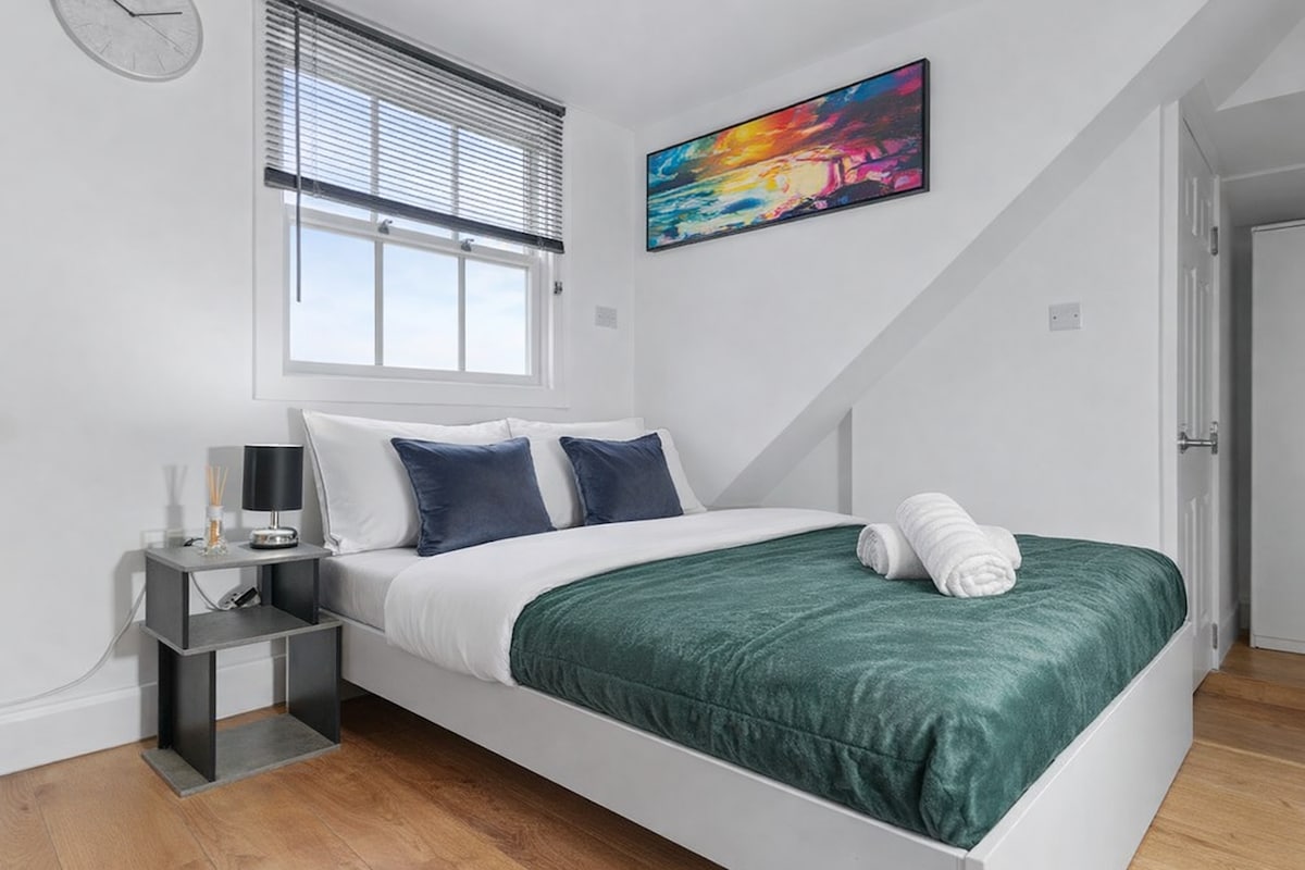 Appartement de luxe sur la verdoyante New Walk avec vue panoramique sur Museum Square depuis la chambre et le salon à travers les fenêtres à guillotine. Réveillez-vous dans un lit king size orné de draps en coton égyptien. Machine à café et cuisine entièrement équipée, idéale pour cuisiner un dîner anglais complet ou rôti, avec vue sur le musée. Télévision 4K 65" avec Netflix. Éclairage doux, douche à effet pluie. À 5 minutes de la gare ; De Montfort Hall 10, Curve 8, Tigers Stadium 12 minutes. Havre paisible et élégant sur le joyau de Leicester, New Walk 🍃