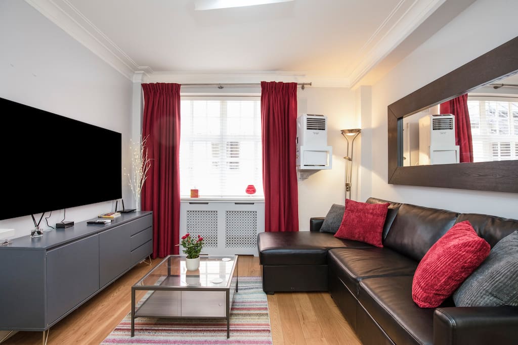Appartement récemment rénové au 1er étage au cœur de Londres, à quelques minutes d'Oxford Street et des commodités du West End. L'appartement comprend une chambre double attenante (lit King Size 160x200cm), une deuxième chambre avec 2 lits simples (80x200cm) qui peuvent être empilés (pour plus de place) ou combinés (pour un lit double), une deuxième salle de bain avec bidet. Le séjour comprend un canapé convertible pouvant accueillir 2 personnes. Cuisine entièrement équipée, climatisation, télévision, table à manger pour 6 personnes. Il est strictement interdit de fumer.