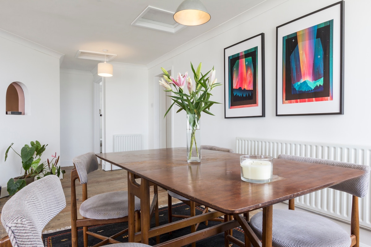 Loft avec vue sur Walpole Bay. Au 3e étage, pas d'ascenseur ! PAS DE TÉLÉVISION !!! C'est un endroit tranquille avec des bizarreries - c'est un lieu de rencontre bohème plutôt qu'un hôtel cinq étoiles. Ne réservez pas si vous aimez la télévision car vous serez déçu. Il est à environ 15-20 minutes à pied de Turner ou Botany Bay. Lumineux, calme, vue imprenable. Une chaise suspendue pour que vous puissiez littéralement vous détendre. Chaises Ercol, tissu House of Hackney.