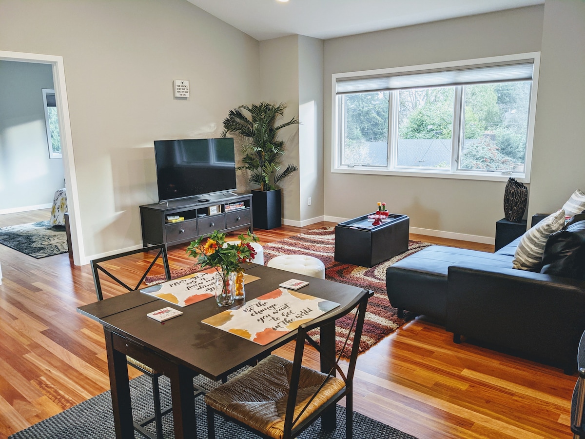 Bienvenue dans notre confortable maison d'hôtes ADU située dans le sous-sol de notre maison nouvellement construite. Un quartier calme et sûr avec un accès rapide aux autoroutes 405 et 520. Vous pouvez facilement explorer Bellevue, Kirkland et la région de Seattle à proximité. Veuillez noter que notre Airbnb est situé sous notre cuisine. Nous voulons être francs et transparents à ce sujet pour définir des attentes précises. Nos journées de semaine commencent à 6h30/7h et vous pouvez nous entendre marcher dans la cuisine si vous êtes sensible au bruit.