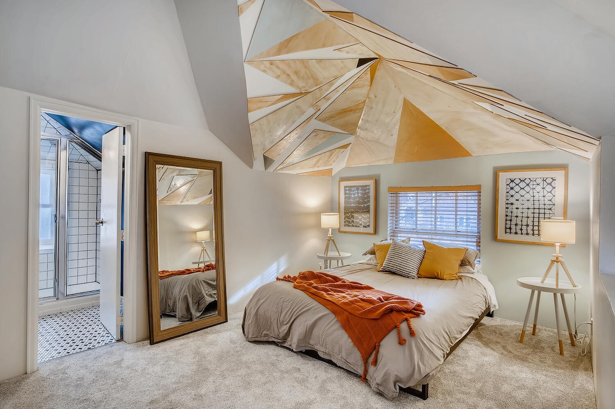 Lumineux/central, 1 chambre, 1 salle de bain, grange près du centre-ville dans un beau quartier situé à quelques pâtés de maisons de nombreux bons restaurants, bars, parcs, cafés, et plus encore. Détendez-vous près de la cheminée, écoutez des vinyles, profitez des plantes tout autour. Grand patio avec balançoires. Chambre spacieuse avec matelas queen size luxueux, literie en coton et rideaux occultants. Espace de travail adapté aux ordinateurs portables et portes de grange à l'étage. Accès facile à tout ce qui se trouve à Denver, mais vous pouvez simplement choisir de rester à l'intérieur.