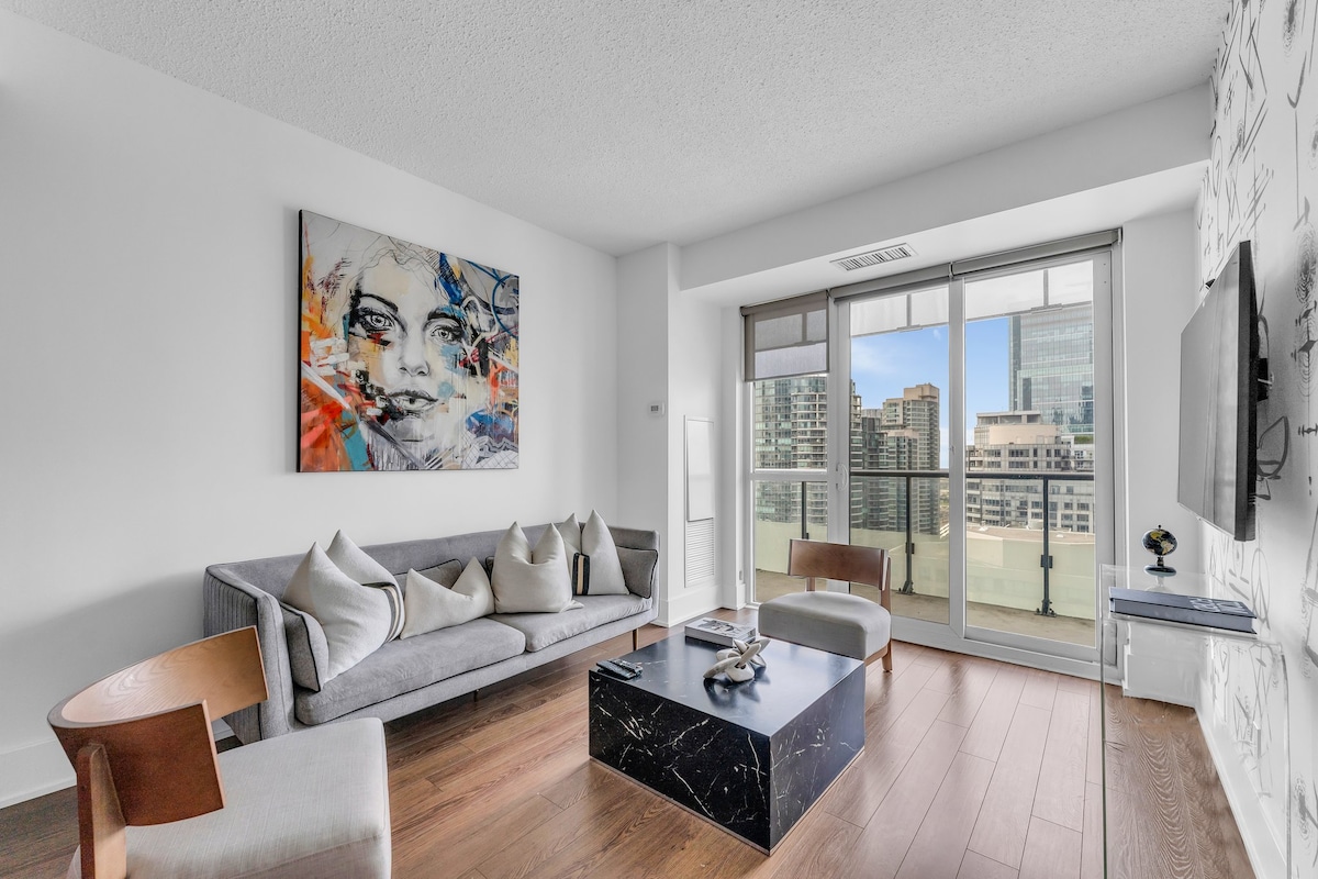Step into luxury at this stylish condo that sleeps 4 nestled in the vibrant Entertainment District. Immerse yourself in city life with proximity to iconic attractions such as the CN Tower, Metro Convention Centre, Rogers Centre, & Scotia Bank Arena—all just steps away. A short stroll leads you to an array of upscale dining, shopping, and entertainment options. Enjoy the modern and tranquil ambiance we've curated within the unit, while taking in the breathtaking CN Tower view from the balcony.