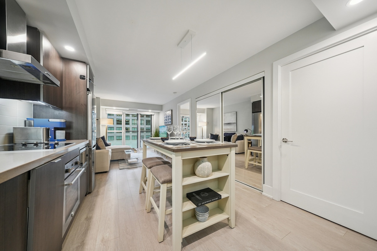 This modern 2BR luxury suite offers everything you need: open-concept layout with high ceilings and hardwood floors; tastefully furnished with a cozy living area, sectional sofa, armchair, and large smart TV; sleek kitchen with island seating for 4 guests; dedicated workspace; two private bedrooms with queen beds; two full bathrooms; in-suite washer/dryer. Bright and airy with natural light throughout. High-speed WiFi, great views, and parking included! Unbeatable location—walk to everything!