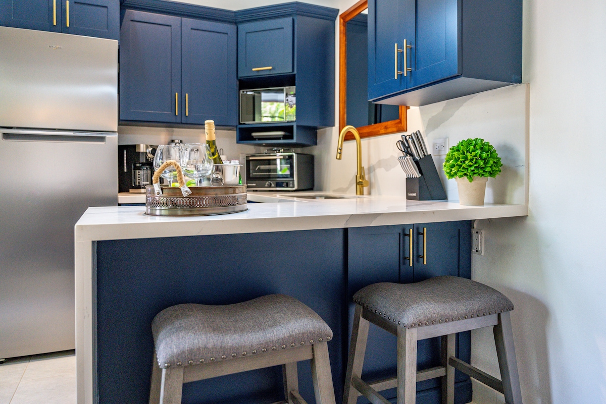 Cette confortable retraite d'une chambre avec un lit queen size dispose d'une entrée privée, d'un salon extérieur spacieux et d'un charmant salon et d'une cuisine. Préparez de délicieux repas dans la cuisine entièrement équipée, puis rafraîchissez-vous avec la climatisation et les ventilateurs de plafond. C'est le refuge tropical parfait pour se détendre dans le confort et le style !