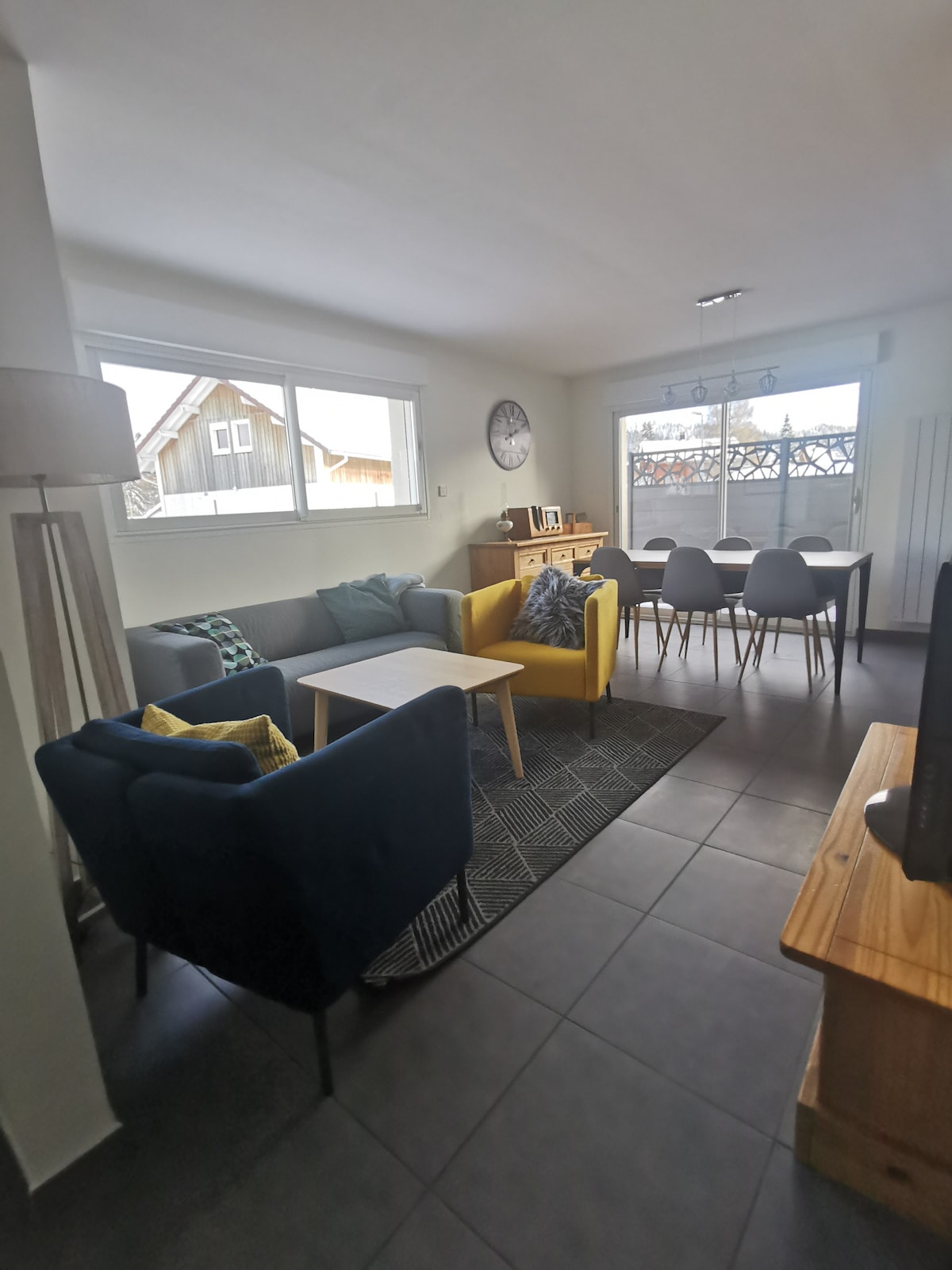 Maison mitoyenne meublée, neuve de 65 m2 d'une capacité maximale de 6 personnes. Située dans un quartier calme, elle est proche d'un arrêt bus pour se rendre au village ou sur le domaine skiable en hiver. Notre région est idéale pour le ski nordique et alpin et pour les randonnées, le VTT et pour profiter de nos lacs . Terrasse goudronnée devant la maison avec salon de jardin et barbecue. 1 local fermé à clef (ski, vélo, matériel....) prêt matériel bébé sur demande parking privatif 2 places