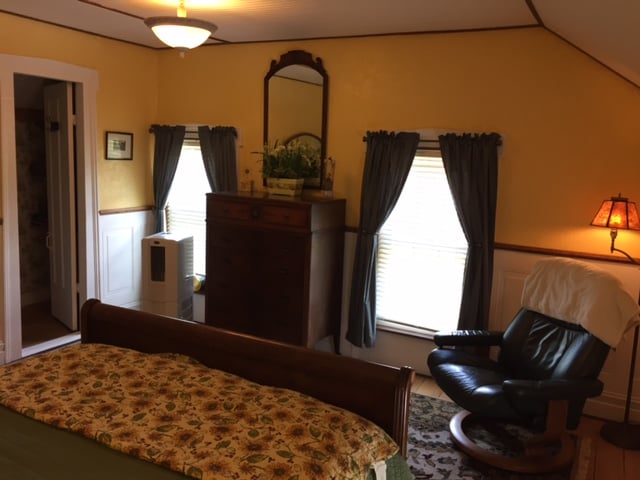 With an excellent location on Broad St. in Hamilton Village, the space is just a block walk to campus or downtown. There is a private entrance to the ensuite on the 1st floor (keyless entry code). It has a private bath (shower), king bed, smart TV with basic cable, Keurig, mini fridge, sitting area, and WiFi. A mini-split provides heat and air conditioning. Also, a fireplace w/remote control. A twin rollaway is available upon request. This suite is perfect for campus visitors.