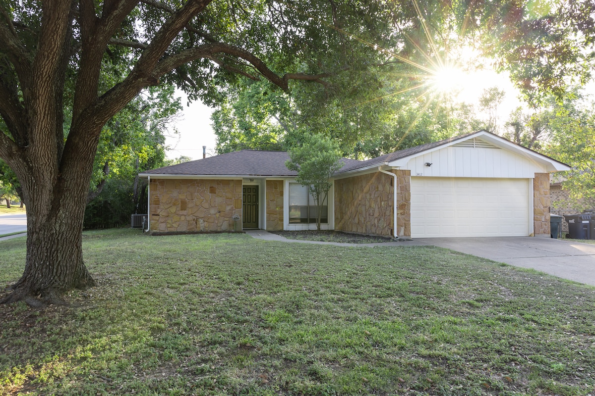 Récemment rénovée, spacieuse et lumineuse ! Cette maison familiale est située à 3 miles du campus et sur la ligne de bus 34 (FISH CAMP). Tout nouveau mobilier et matelas ! Parfait pour les familles avec des équipements pour les enfants (lits superposés, ping-pong, basket-ball, chaise haute, parc pour bébé, etc.) Grande cour arrière avec patio et barbecue. Grand parking et garage. À quelques minutes de l'épicerie H-E-B, de charmants parcs familiaux et de pistes cyclables, d'une grande sélection de restaurants et de Santa's Wonderland ! **Politique stricte d'interdiction des animaux de compagnie**