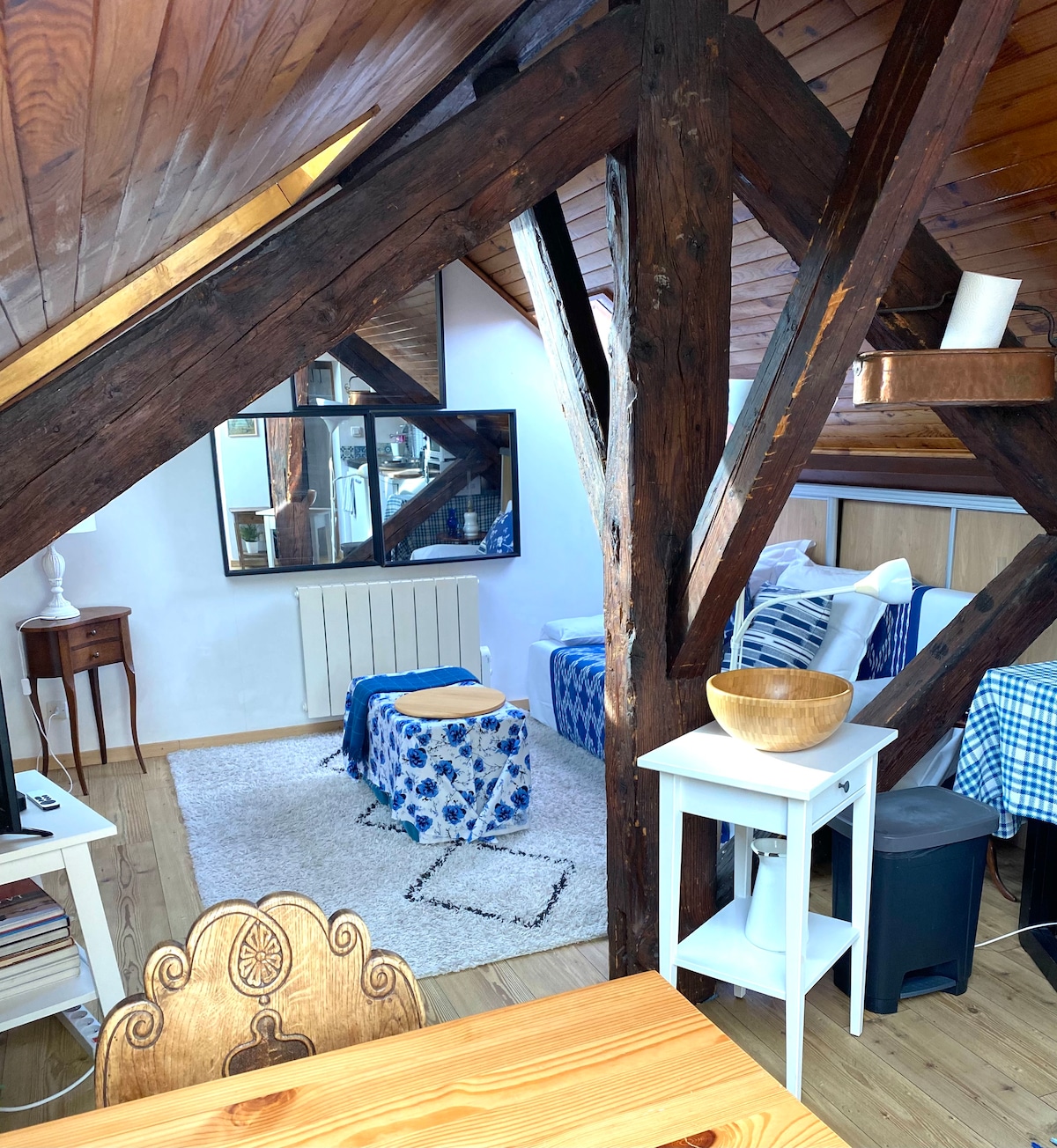 The attic is ideally located in the heart of the old town in an ancient building close to all amenities such as supermarkets, cafes, bars, restaurants, pharmacies, and shops. There is a great bakery and a Bio market on the corner. It's a two-minute walk to the bus station "Ferney Marie." Bus F/64/66 goes to the Airport, Geneva, UN, and CERN. Beautiful view of the Mont Blanc and the Jura mountains.