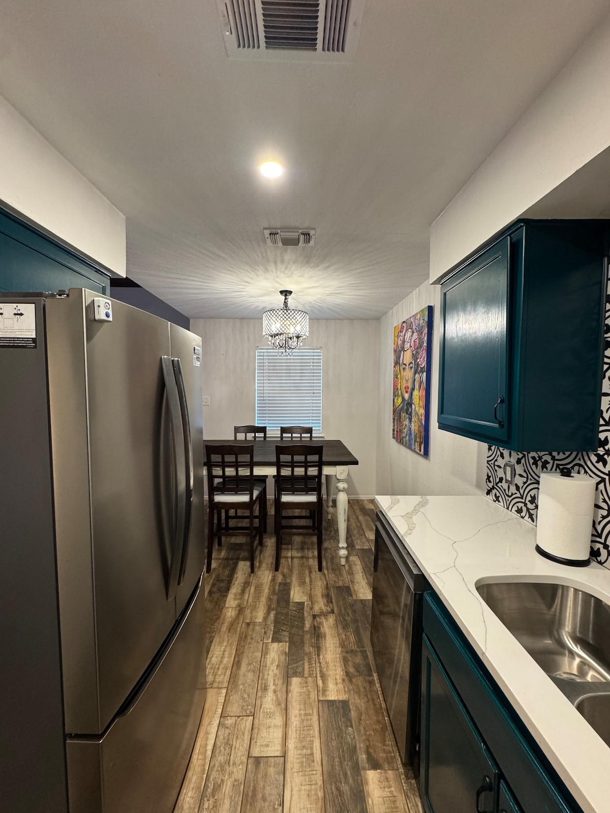 This cozy 2 bedroom, 2 bath home is located right in the middle of the DFW Metroplex, so it’s not far to go anywhere you want to visit. The Tex Rail station is a short walk away, so the train can take you to Dallas or Fort Worth and lots of places in-between. You can sleep 6 comfortably in the king bed, 2 full beds, and sofa bed. The kitchen is fully stocked, including a coffee bar for that cup of morning joe. There’s working space with a comfortable chair, and we are kid and dog friendly.