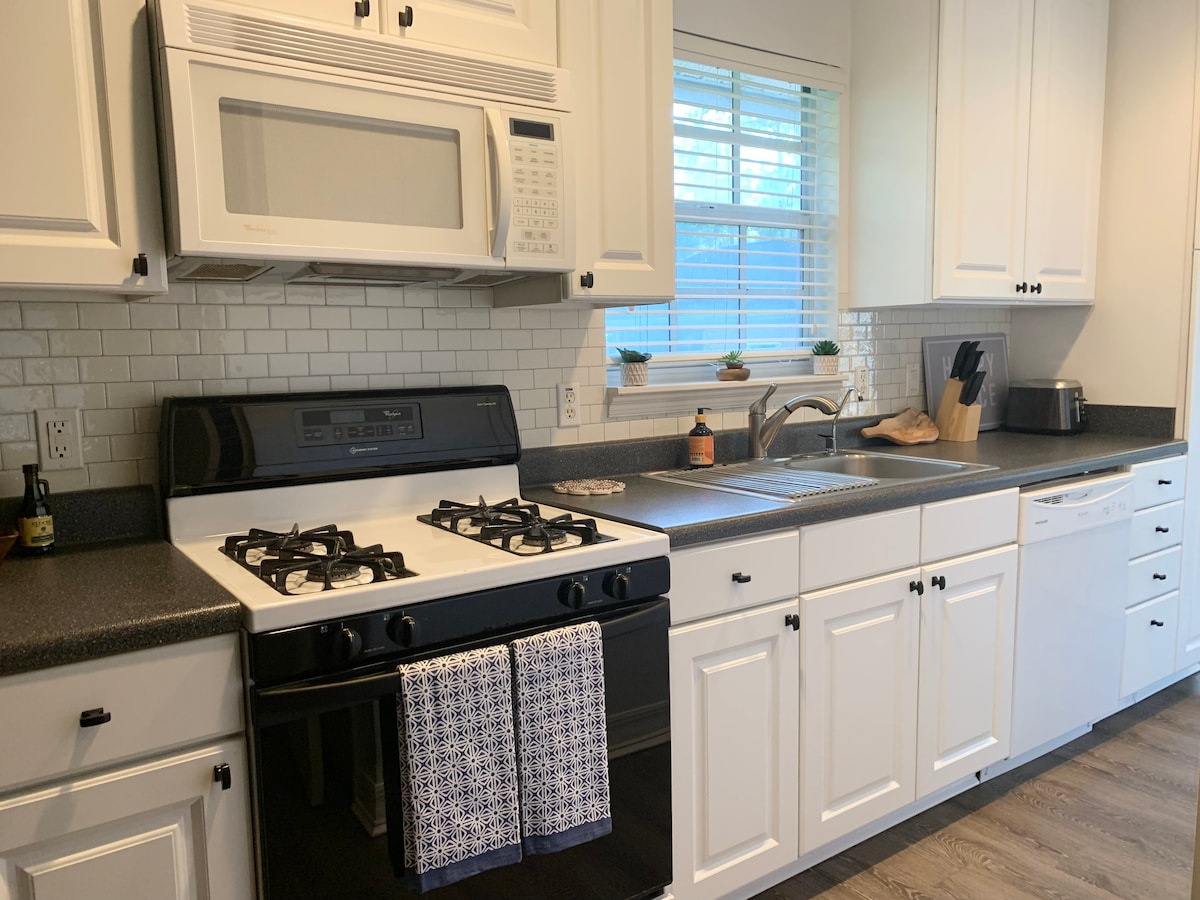 Dragonfly Cottage: This cozy and stylish coastal guest home is centrally-located, minutes drive to restaurants, shopping, and the beach. This cottage is a full guest house with every convenience. A separate bedroom with queen sized bed, dresser and closet, a dedicated workspace with wireless charging, bathroom with shower/tub and vanity, a full kitchen with Keurig, range, microwave, refrigerator, and a washer/dryer unit for your exclusive use, private entrance and parking for 1-2 cars.