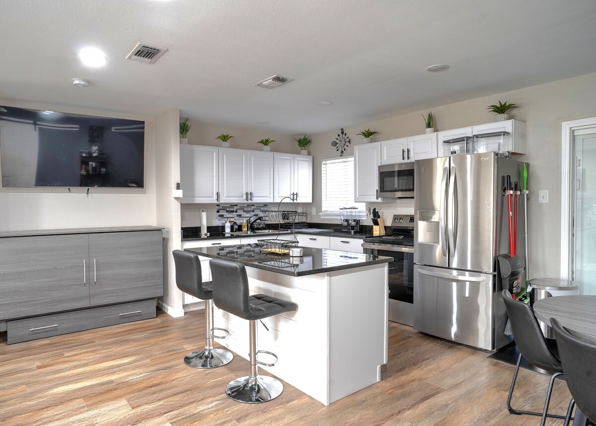 À Casita Azul, nous garantissons un séjour confortable et inoubliable au cœur de San Antonio. Notre propriété se trouve dans un quartier en plein essor qui offre des commerces, des cafés et des restaurants à proximité, à quelques minutes en voiture/Uber ! Vous pouvez facilement vous rendre à l'AT&T Center, au River Walk et au centre-ville de San Antonio sans aucun problème. Profitez d'une escapade dans notre maison de 3 chambres et 2,5 salles de bain avec une oasis dans l'arrière-cour avec piscine Cowboy, salle à manger extérieure, barbecue, jeux, foyer et home cinéma haut de gamme.