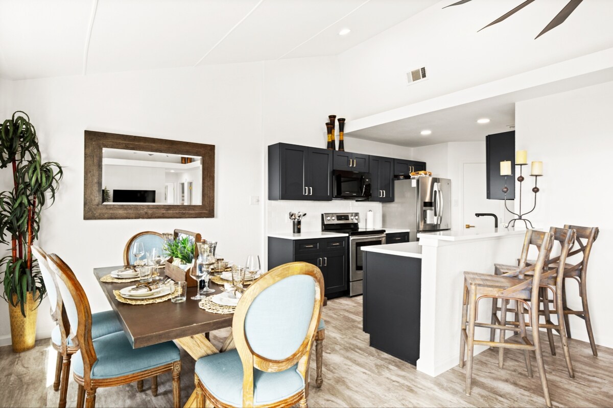 Construite avec du calcaire du Texas, cette maison d'inspiration zen offre un intérieur frais et apaisant, un foyer au gaz lumineux, une salle de bain luxueuse et un petit jardin extérieur accueillant. Améliorée par l'Internet haut débit 1000 Fiber d'ATT, cette maison sereine et lumineuse est parfaite pour les nomades numériques, les familles, les tribus et les amis qui se réunissent. Profitez d'un accès gratuit à notre immense piscine et parc communautaires ! Afin de maintenir une maison sans allergène pour nos voyageurs, les animaux de compagnie et de soutien ne sont pas autorisés.