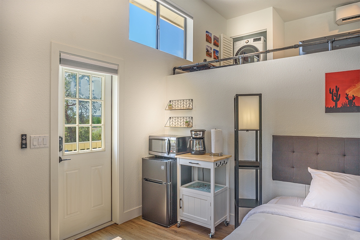 This newly renovated (2025) modern desert studio offers the perfect blend of privacy and comfort. While attached to the main house via double exterior soundproof doors, it has its own separate entrance, ensuring complete privacy and a peaceful retreat. Inside, you’ll find a luxurious king-size bed, creating the ideal space for rest and relaxation. Large windows frame breathtaking views of the surrounding desert, filling the studio with natural light and offering a serene, calming atmosphere.