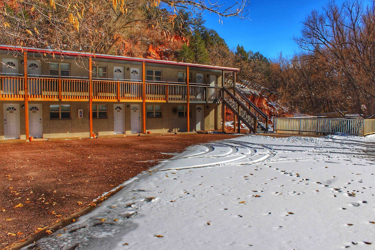 La promenade a le jardin des dieux. Chambres récemment rénovées, propres/calmes/confortables dans un établissement non-fumeur. En dehors de la route principale avec vue dégagée sur Pikes Peak, service de ménage, téléviseurs intelligents et four Wi-Fi gratuit, réfrigérateur et cafetière avec condiments à café. Randonnée pédestre/escalade et vélo, avec des courts de tennis et Fountain Creek de l'autre côté de la rue. Promenade facile dans le centre-ville de Manitou Springs. Les meilleurs atouts de Manitou Springs se trouvent aux portes du Red Wing Motel