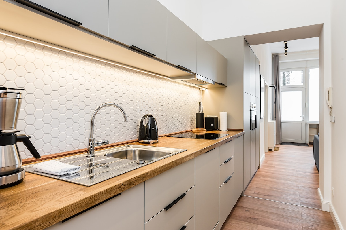 Bienvenue dans cette suite privée spacieuse et élégante située au cœur historique de Berlin, à quelques pas seulement des monuments les plus importants de la ville, d'excellents restaurants et de zones commerçantes animées. Profitez d'une intimité totale, d'une vue paisible sur le jardin, d'un sommeil tranquille et d'un confort moderne raffiné. Les baies vitrées remplissent l'espace de lumière naturelle, tandis qu'une chambre luxueuse avec lit king size, une cuisine haut de gamme et une salle de bain élégante avec douche à effet pluie et baignoire créent une retraite calme en plein cœur de la ville.