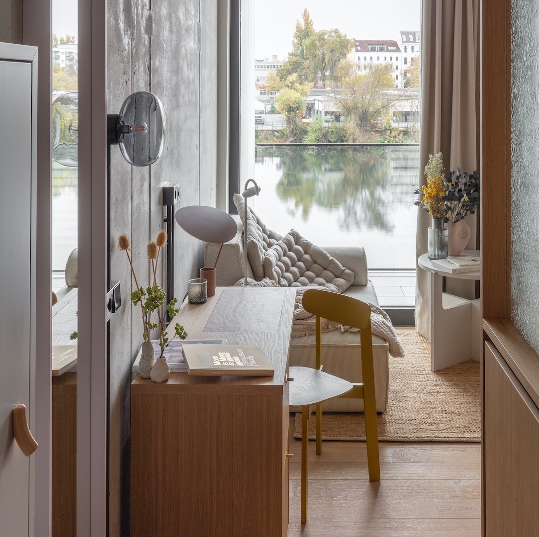 Sentez-vous comme chez vous avec 22 m² d'espace intelligemment conçu et une vue impressionnante sur la rivière Spree depuis votre propre balcon. Vous disposerez d'un lit king size britannique confortable de 150 cm x 200 cm, d'un bureau pour travailler, d'une salle de bain moderne, d'une kitchenette pour cuisiner sans effort et d'un accès à un balcon privé avec vue sur la rivière Spree. Vous avez du linge ? La buanderie commune est à votre disposition à votre guise. Avertissement : l'appartement sur la photo n'est peut-être pas celui dans lequel vous restez.