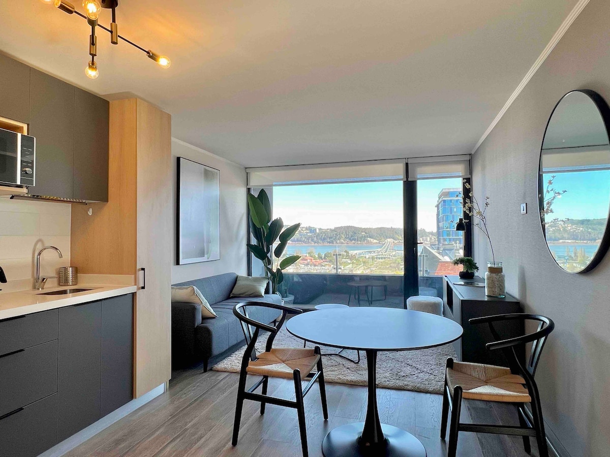 Disfruta de este departamento nuevo, full equipado para dos personas, cerradura inteligente, céntrico y muy cómodo, ideal para alojarse en Concepción. A pasos de la Universidad de Concepción, Hospital Regional, Tribunales, etc El edificio cuenta con Seguridad conserjería 24/7, Circuito Cerrado de Tv, Estacionamiento privado Subterráneo y Lavandería del edificio