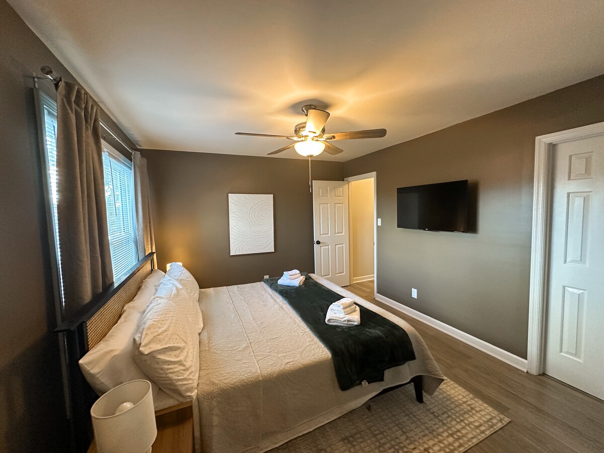 Cet appartement est construit dans un sous-sol. Il dispose de sa propre porte, d'une salle de bain privée, d'un salon, d'un grand canapé en L, d'un ensemble TV-tray, d'une télévision, d'un Roku avec Netflix, d'une armoire avec réfrigérateur, d'un four à micro-ondes, d'une cafetière, d'une bouilloire électrique et d'un évier. La chambre dispose d'un lit King Size, d'un lit Queen Size gonflable pouvant être installé pour des invités supplémentaires, d'un canapé, d'un ventilateur de plafond, d'un placard, de tables de chevet, d'un radiateur portatif, d'un ventilateur portatif et d'une commode. Stationnement pour deux véhicules ou plus. Seuls deux adultes vivent au rez-de-chaussée de la maison.