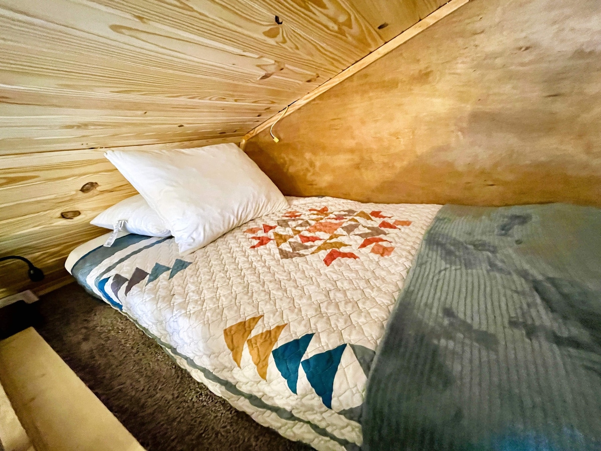 *Nous avons récemment ajouté un ventilateur supplémentaire au loft pour aider à la chaleur estivale et un foyer avec des sièges à l'arrière.* Wi-Fi par fibre optique, cuisine bien approvisionnée et barbecue extérieur ! Emplacement incroyable, juste derrière le terrain de camping à l'entrée du parc d'État Petite Jean ! Ce logement affiche un style résolument unique. La cabane en A est conçue soigneusement pour maximiser l'espace sans sacrifier les équipements.