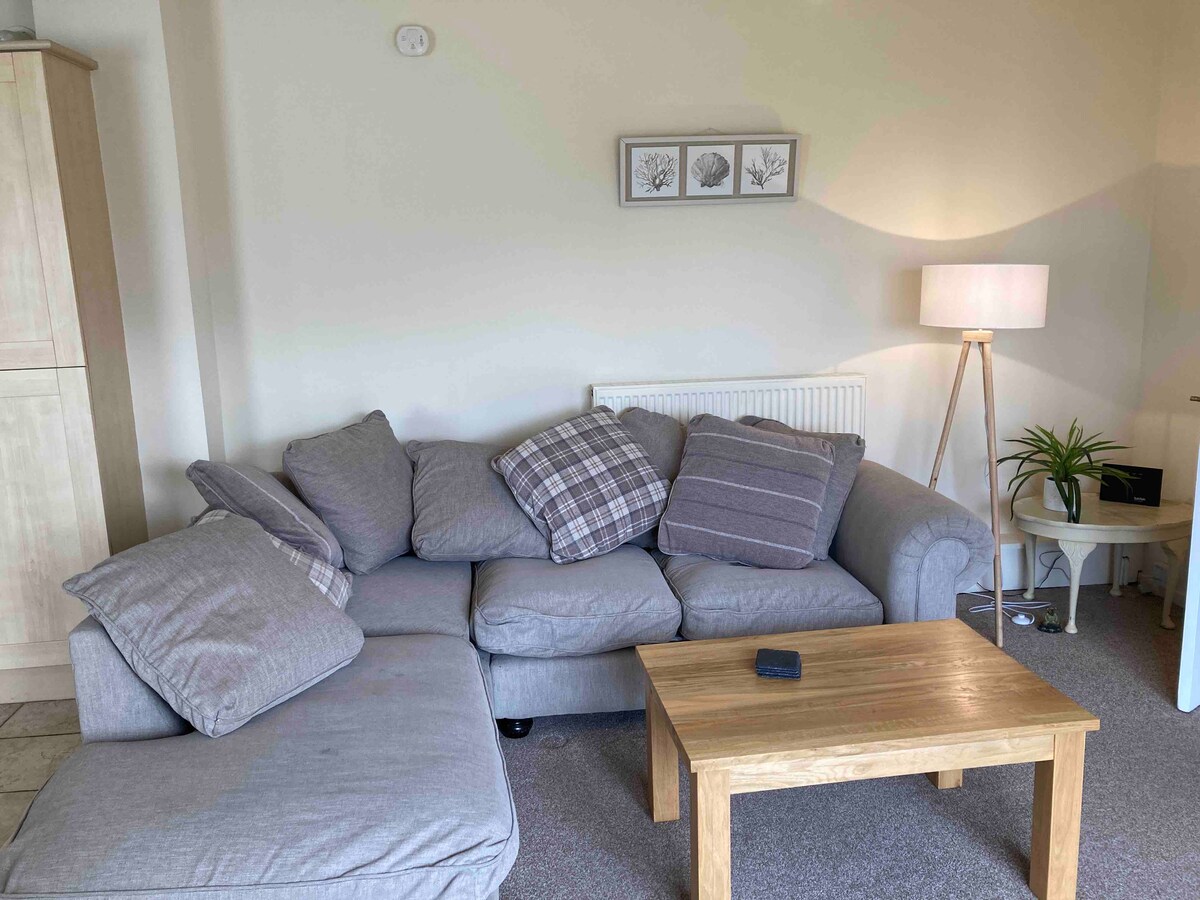 * Réservations d'hiver longue durée acceptées * Appartement au rez-de-chaussée avec cuisine toute neuve. À quelques minutes à pied d'une plage, adaptée aux couples et aux familles. Il dispose de deux chambres, une double et une de lits superposés, (des lits superposés ne conviennent pas aux adultes). Terrasse et jardins communs avec vue sur le parcours de golf du Pays de Galles du Nord, la montagne Conwy et le Great Orme. Espace de vie ouvert et entièrement équipé pour manger à l'intérieur. Idéalement située entre Llandudno et Conwy