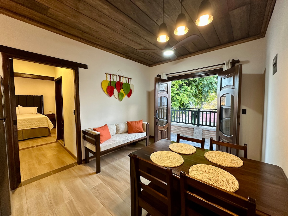 Charmant appartement avec vue sur la vallée de Copán Ruinas. L'appartement dispose de : - 1 chambre spacieuse avec deux lits Queen Size pour un repos agréable. - Canapé-lit, idéal pour un invité supplémentaire. - Salle de bain avec eau chaude. - Cuisine pour préparer tes repas préférés. - Salle à manger confortable pour profiter de vos repas avec une vue incroyable. - Un couloir avec hamac pour se détendre. Parfaitement situé à proximité du centre mais suffisamment à l'écart pour profiter de la paix et de la sérénité.