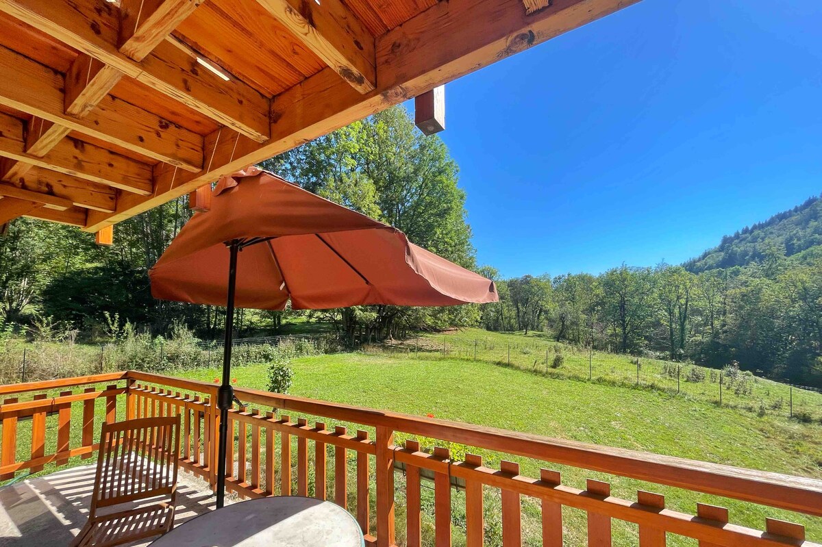 Une vue panoramique époustouflante sur les montagnes depuis le balcon, une pièce à vivre tout bois, grande hauteur sous plafond, une atmosphère qui invite à la détente... Le balcon s’ouvre sur un terrain en pente bordé par un ruisseau, discret selon la saison avec en fond sonore, le charme discret des clarines. Une immersion nature totale. Chambre intime, parking, accès facile toute saison, local matériels. Draps, serviettes, TV, internet fibre. Check-in libre. Idéal pour un duo en sérénité !
