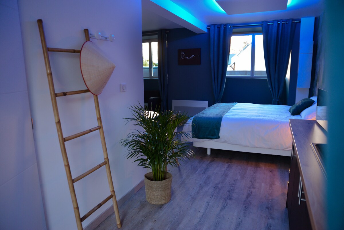 Bénéficiez de 10% sur le tarif à partir de 2 nuits à L'Evasion. Le petit déjeuner est inclus. Chambre avec un véritable *Jacuzzi (non pas une baignoire balnéo) privatif pour un moment romantique et coquin dédié au bien-être. Décoration moderne, soignée et intime. Nous pouvons vous proposer des options comme un plateau apéritif, une box romantique, bouteilles de vin, champagne... *L'eau du Jacuzzi est changée après chaque location.