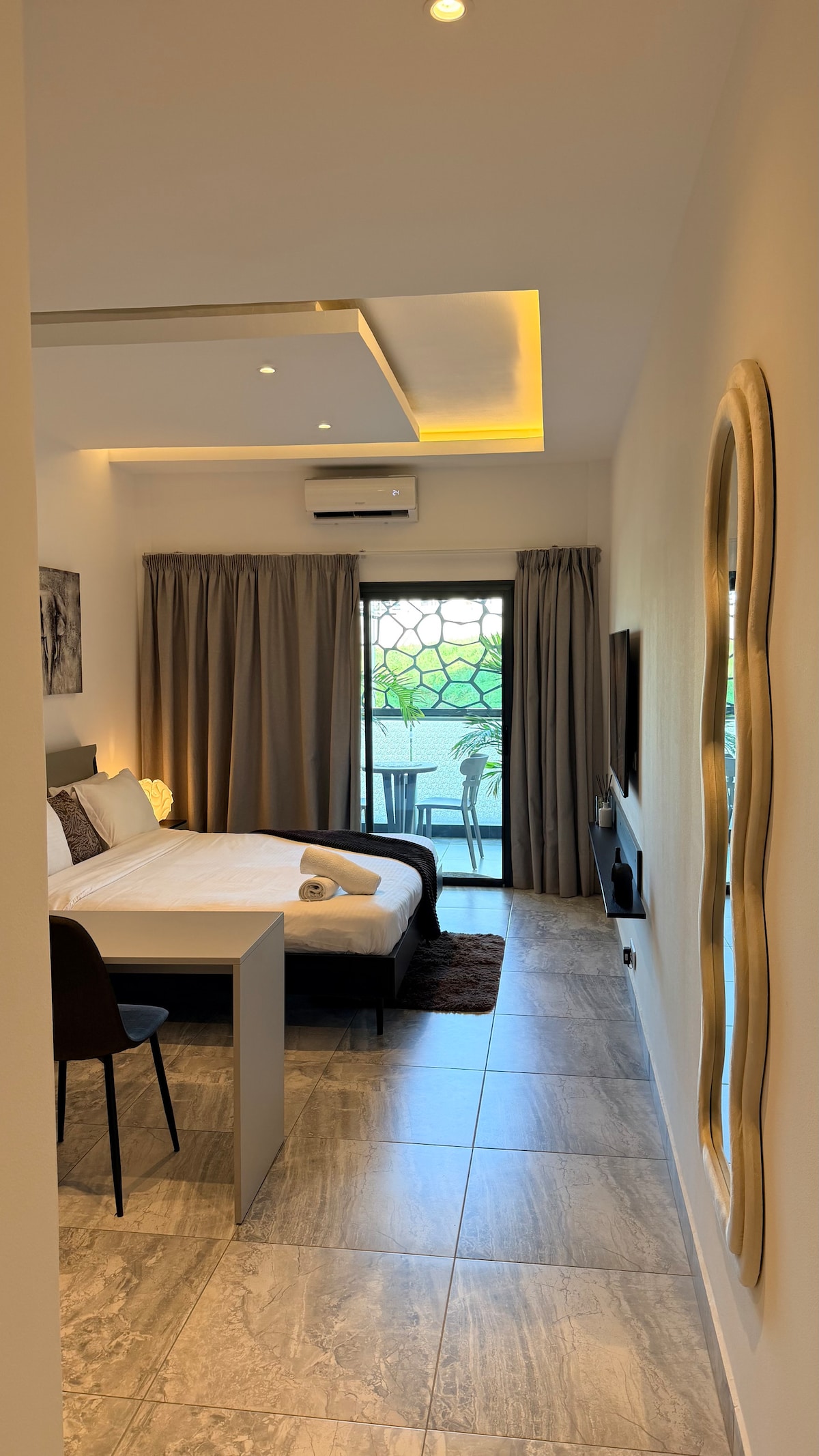 Superbe studio avec coin salon, terrasse, cuisine, salle de bain privative, au dessus d'une maison. Meublé, équipé, avec cuisine équipée (TV, frigo, ustensiles) et literie. Tous services inclus: nettoyage, blanchisserie du linge, changements des draps et nettoyage hebdomadaire. Le propriétaire (famille française) habite en bas mais vous avez votre propre entrée. Les hôtes ont accès à la piscine, jardin et à la salle de sport. Petit déjeuner, location voiture et transfert aéroport possibles.