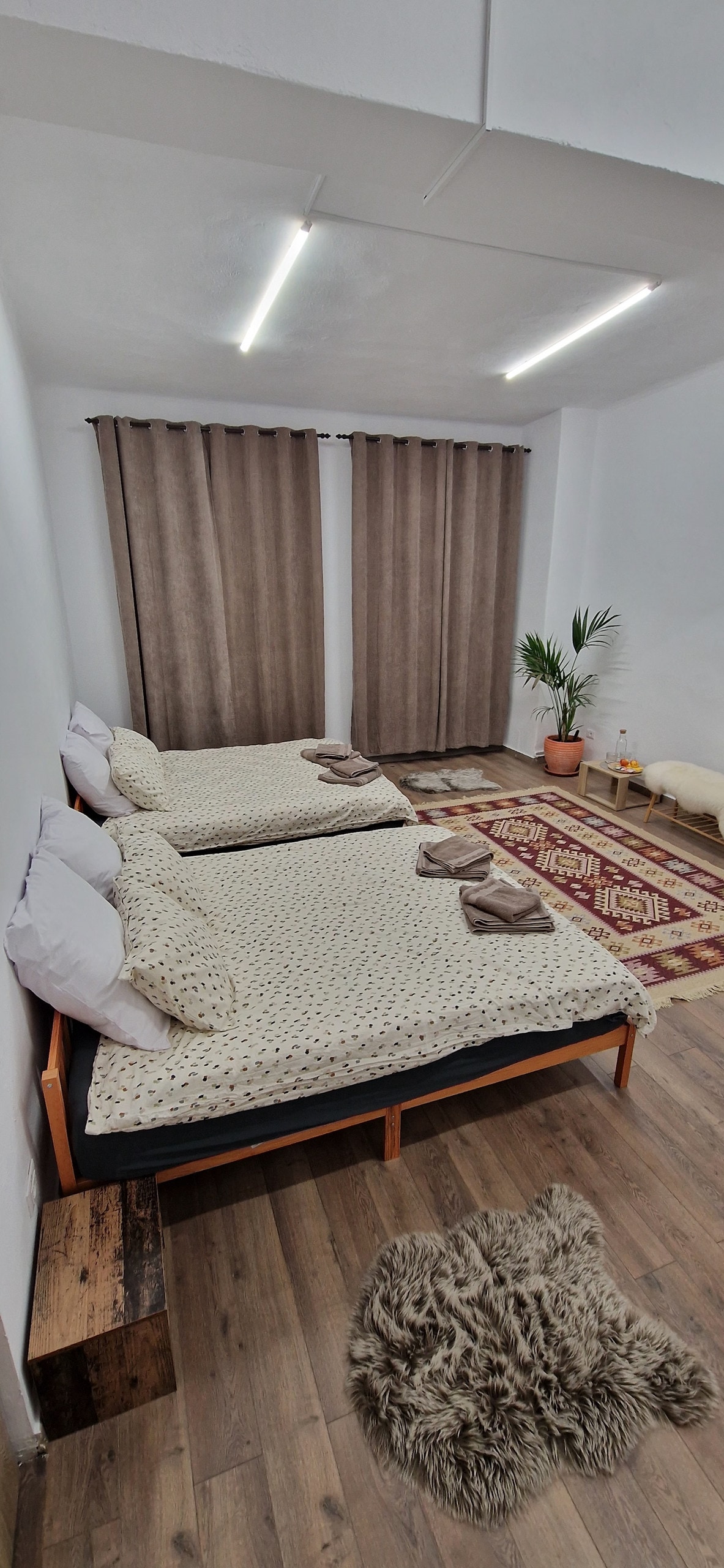 Situé au premier étage d’une maison traditionnelle, ce logement entièrement rénové dispose de 4 chambres confortables avec mezzanines et salles de bains privées, une cuisine équipée et une salle de séjour en bois très lumineuse avec vue sur les monts Bucegi et Craiului. Chaque chambre dispose de sa salle de douche, d’une vue sur la citadelle et d’un thermostat individuel. Situation centrale, centre de Rasnov accessible à pied, citadelle à moins d’un km, gare à10 min et bus pour Bran et Brasov.