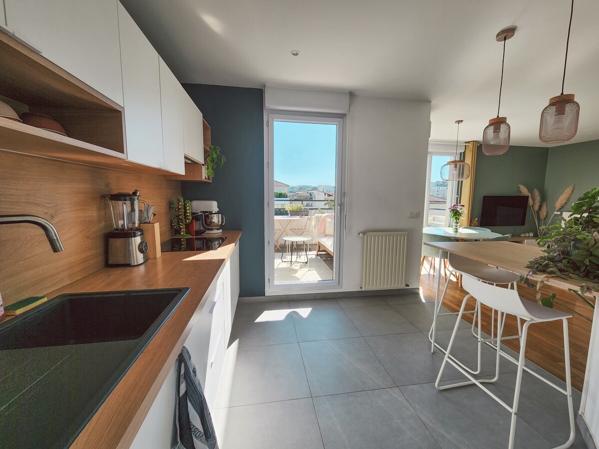 Bienvenue dans votre prochaine escapade urbaine, dans le vibrant quartier de la Croix-Rousse à Lyon! Cet appartement d'exception, fraîchement rénové et méticuleusement décoré, vous ouvre ses portes pour un séjour inoubliable. Vue Féérique sur Lyon: Perché dans un emplacement privilégié, cet appartement offre une vue spectaculaire sur toute la ville. Jacuzzi Duo: Imaginez-vous plongé dans un bain relaxant à l'ambiance japonisante. Notre espace est conçu pour des moments de détente sans égal.