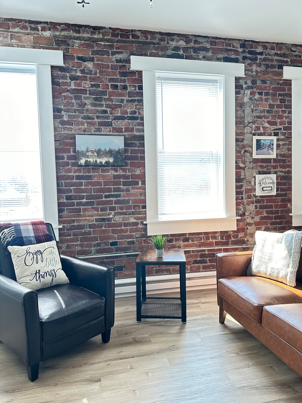 Loft lumineux et impeccable de 2 chambres dans le quartier historique du centre-ville de Plattsburgh (1869) : une véritable alternative à l'hôtel. Pierre apparente + brique, fenêtres surdimensionnées, salon ouvert d'environ 600 pieds carrés et un îlot de cuisine pour les repas ou les journées ordinateur portable. Marchez jusqu'au café, aux restaurants, au Strand/théâtre et au centre d'art, aux monuments, au bord de la rivière/du lac et à la piste cyclable. Antiquités/friperie à proximité. Linge de lit blanc immaculé + oreillers à double enveloppe. Coopérative d'alimentation à côté. Bâtiment paisible : pas de fêtes/événements. Wi-Fi puissant et arrivée facile pour les voyages d'affaires.