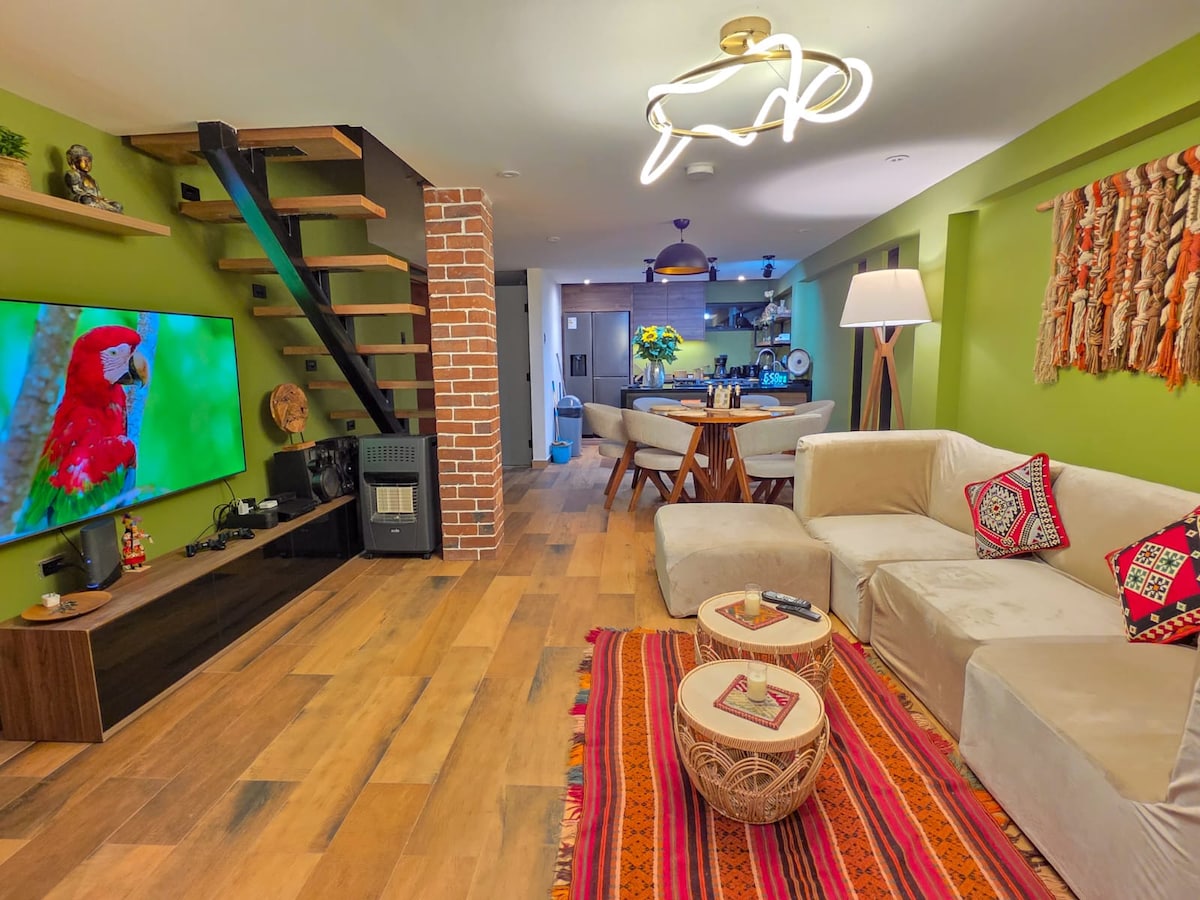 Bienvenue à TAWA - Appartement duplex de luxe dans le centre-ville de Cusco, en face d'un parc dans un quartier calme et sûr. Finitions de haute qualité, 3 chambres spacieuses avec lit king size et lits jumeaux, et chauffage électrique ! 3 salles de bain privées avec eau chaude 24h/24. Internet haut débit, télévision connectée, cuisine entièrement équipée avec eau filtrée, buanderie, mini-gymnase, 2 terrasses avec vue unique et parking extérieur. À quelques minutes à pied de la Plaza de Armas. **Situé au 4e étage sans ascenseur.