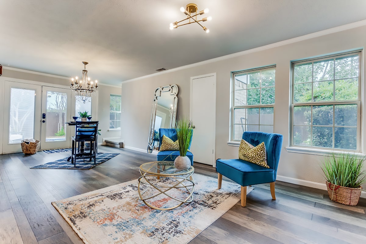 Détendez-vous dans cette élégante retraite d'une chambre au cœur de Dallas, à quelques minutes du centre de congrès Kay Bailey Hutchison. Profitez d'une chambre spacieuse avec lit King Size, de finitions modernes et d'un accès exclusif à une terrasse sur le toit avec une vue imprenable sur la ville. Parfait pour les affaires ou une escapade romantique. Les voyageurs auront accès à une chambre privée avec lit King Size ; deux chambres supplémentaires resteront verrouillées pendant votre séjour. Célébrez avec style : les suppléments pour les occasions spéciales sont répertoriés dans la section manuel de la maison.