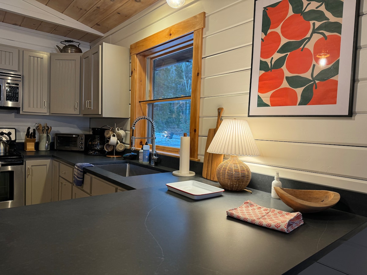 • Perfect for small families or couples, our signature A-Frame cabin features a modern interior gas burning fireplace, soaring ceilings, huge windows, stylish interiors, and all the comforts of home. • This cozy 1,100 square foot space comfortably accommodates up to four guests in two bedrooms (one with a King-size bed and the other with a Queen-size bed) and a shared bathroom. • 7 minute drive to downtown Freeport. • Proud to be ranked in the top 1% and voted Guest Favorite!