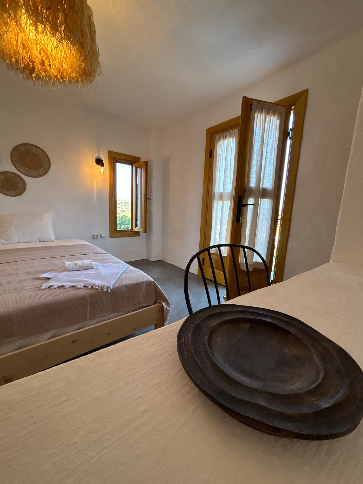 Hi, first of all these are cob houses all made by clay in the traditional stone masonery methods of ancient mediterranean. We're leading a self sustainable life 'as much as we can' so our electricity is coming from solar energy panels which are enough to run a small fridge, laptops, lights and phone charges. Wood fire water heater in the bathroom. We wanted to be far from the crowd so we re a bit not so easy to get at. So its best if you have a 4x4 or u can walk a path uphill for 15 minutes.