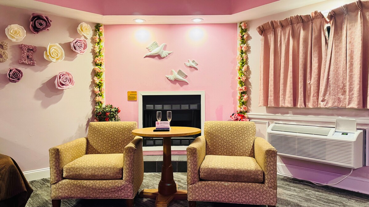 Suite romantique rose avec jacuzzi et cheminée