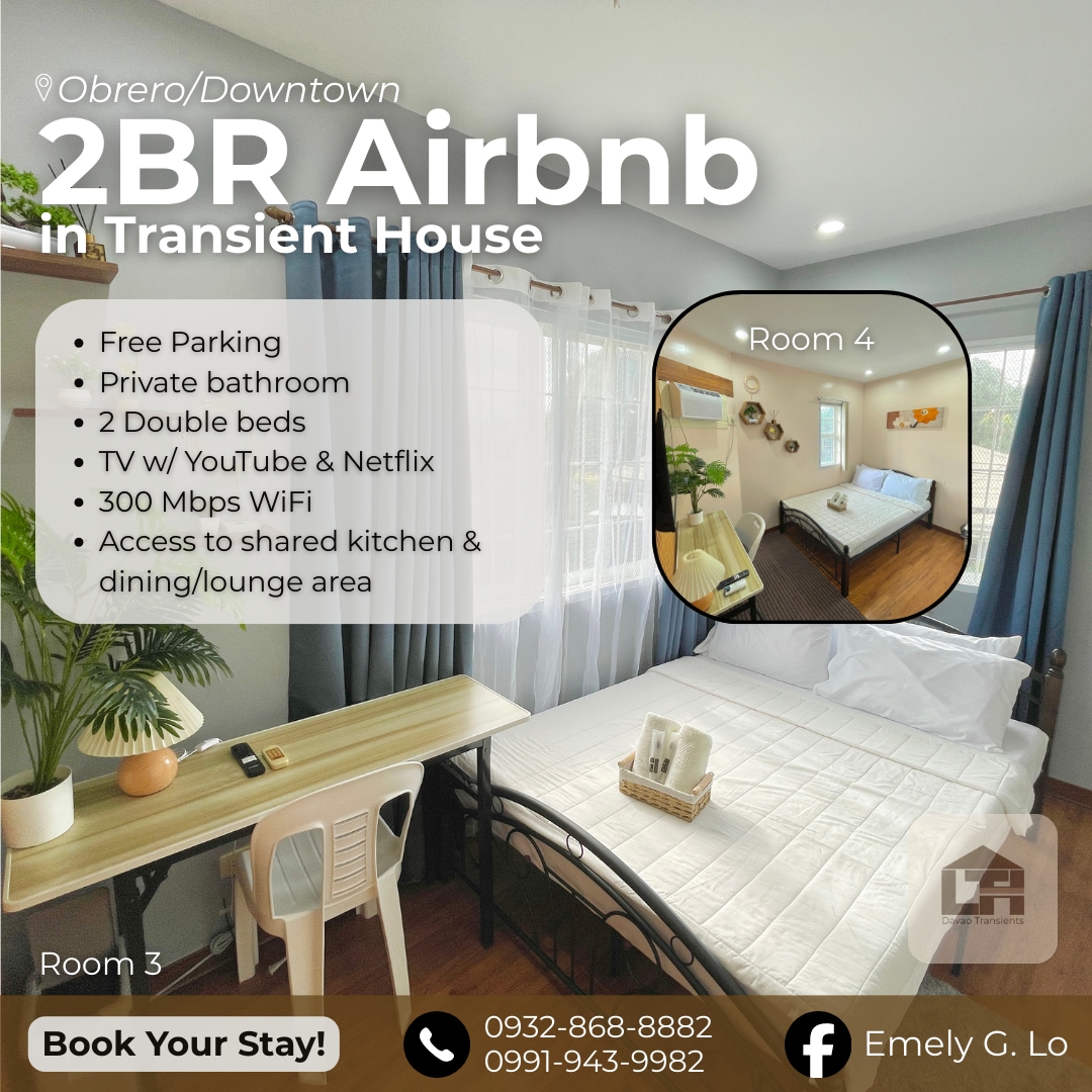 Maison de ville à louer Dans une subdivision sécurisée, gardée et fermée À distance de marche de NCCC choicemart, 7-eleven & autres établissements. À 5 minutes de l'aéroport À 1 trajet d'Abreeza et du centre commercial Gaisano À 10 min en voiture du quai du ferry de Samal 2 chambres climatisées entièrement meublées Avec espace de stationnement Avec wifi GRATUIT 1 Go par jour (rechargeable à vos frais) Les voyageurs recevront un code clé une fois la réservation confirmée. REMARQUE : la salle B sera fermée s'il n'y a que 3 occupants.