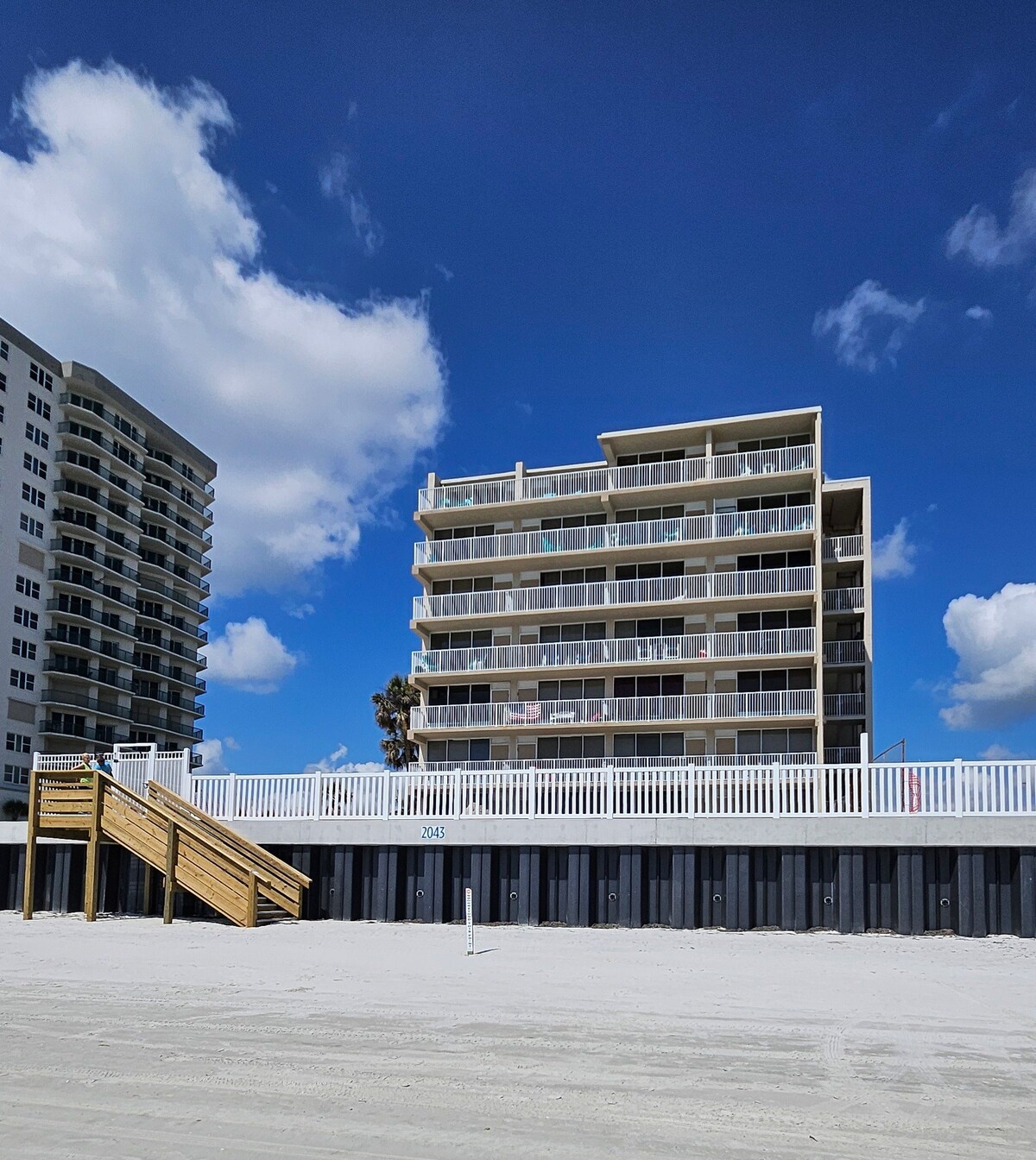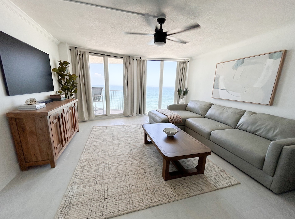 VUES IMPRENABLES SUR LA PLAGE ! Copropriété rénovée de luxe + vue panoramique sur l'océan. Suite principale avec lit King Size, balcon privé en bord de mer + 2e chambre et salle de bain = 2 lits Queen Size. NOUVELLE cuisine entièrement équipée ! Accès direct à la plage vierge sans voiture avec sable doux/ferme, piscine chauffée au bord de l'océan. Retraite familiale haut de gamme - sans fumée ni animaux de compagnie. Réveillez-vous avec de magnifiques levers de soleil sur l'Atlantique ! Escapade tranquille à Daytona Beach Shores - réservez pour vos vacances relaxantes à la plage ! Décoré avec goût pour Noël !