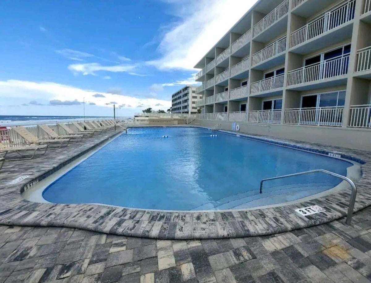 Condo-tel d'une chambre directement sur la plage ! Dispose d'un lit king size dans la chambre et d'un canapé convertible queen size dans le salon. Les logements sont privés et gérés par une association de propriétaires. Nous avons apporté de nombreuses améliorations à cet emplacement privilégié au cours des dernières années. Notre bâtiment est au cœur de tout. Vous ne serez pas déçus ! J'aimerais beaucoup vous accueillir, vous, votre famille ou votre amoureux. N'hésitez pas à m'envoyer un message si vous avez des questions. J'ai hâte de vous retrouver ici sur la belle 🏖️plage de Daytona !