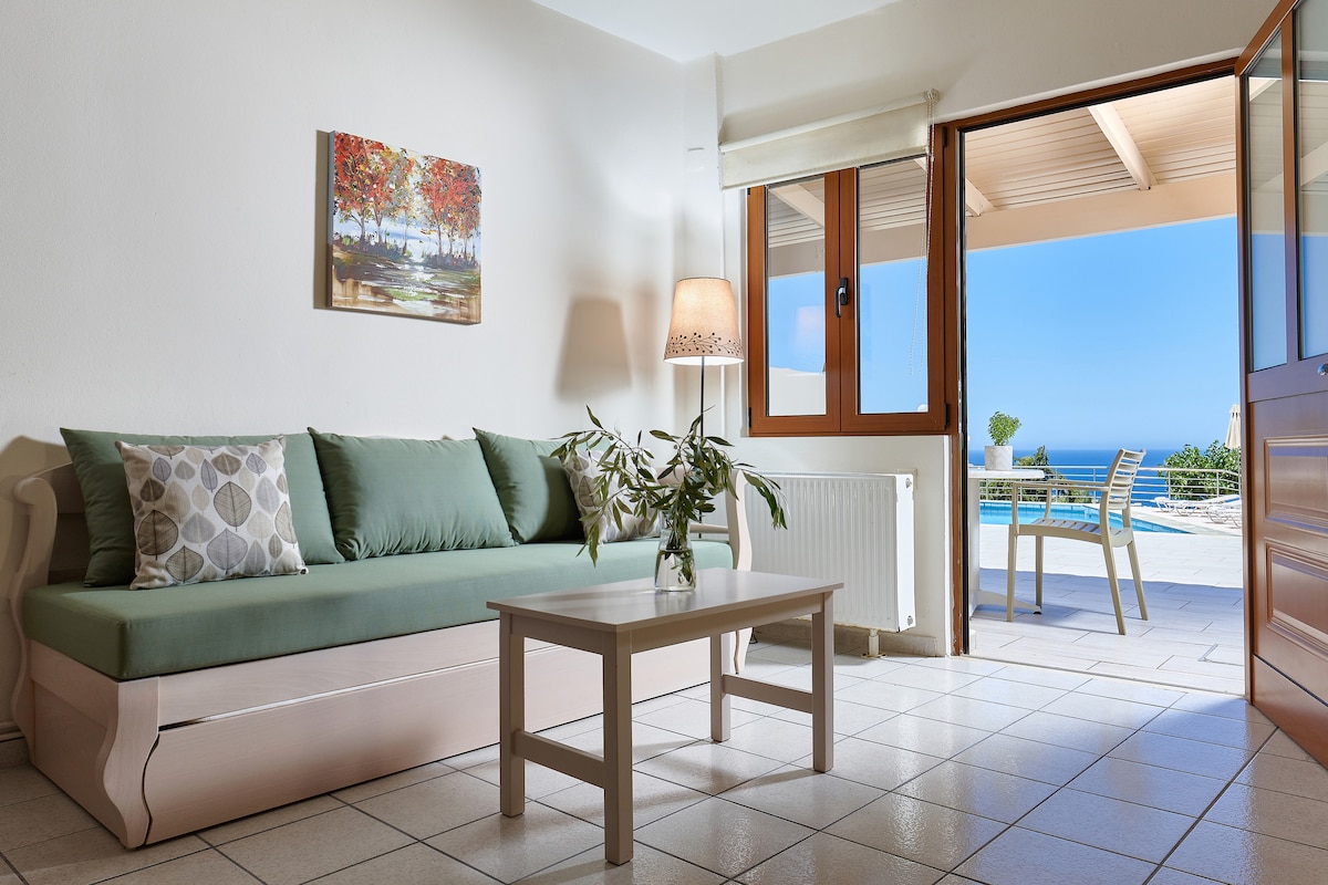 *** Important note *** Notre établissement est en cours de rénovations majeures alors qu’il adopte sa nouvelle identité OZEA – Elevated Living. De nouvelles photos seront disponibles en mars 2026. L’appartement ELIA allie design élégant et confort, avec une chambre et un canapé-lit (jusqu’à 4 pers.). Sa cuisine équipée, ses équipements modernes et son espace extérieur privé avec vue sur la piscine et la mer offrent un séjour détendu et authentique.