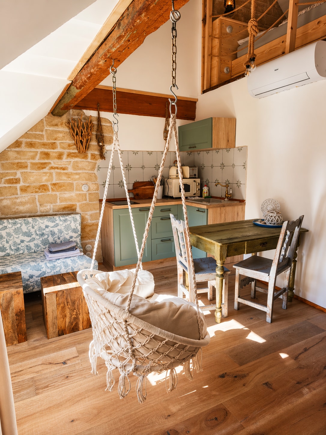 L'appartement au dernier étage est vraiment unique. Il est situé au deuxième étage et l'ensemble du logement a été restauré dans le bâtiment d'origine. Le cadre en bois du toit d'origine, la brique apparente, le plancher d'origine, le poêle en bois entièrement fonctionnel vous aident à imaginer comment les gens vivaient au début du siècle dernier. Le salon principal fait face à l'avant de la maison et vous y trouverez une vue sur la place de la ville, la maison de ville et le célèbre rocher de basalte « Jehla ».