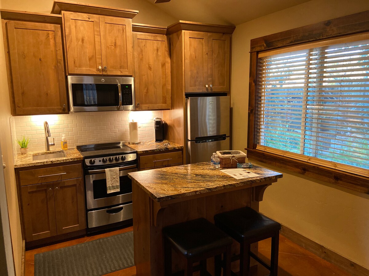 Le Studio est un chalet chaleureux et plus moderne, niché en toute sécurité dans l'arrière-cour d'une maison, en tant que structure indépendante avec une entrée privée, un porche avant et des plantes. Situé dans un quartier résidentiel calme et bordé d'arbres. Il est entièrement meublé, chargé d'équipements... des appareils électroménagers, des ustensiles de cuisine et des condiments aux articles de soins personnels. Accueille confortablement 1 à 2 adultes, avec un lit queen size et un matelas en mousse à mémoire de forme.