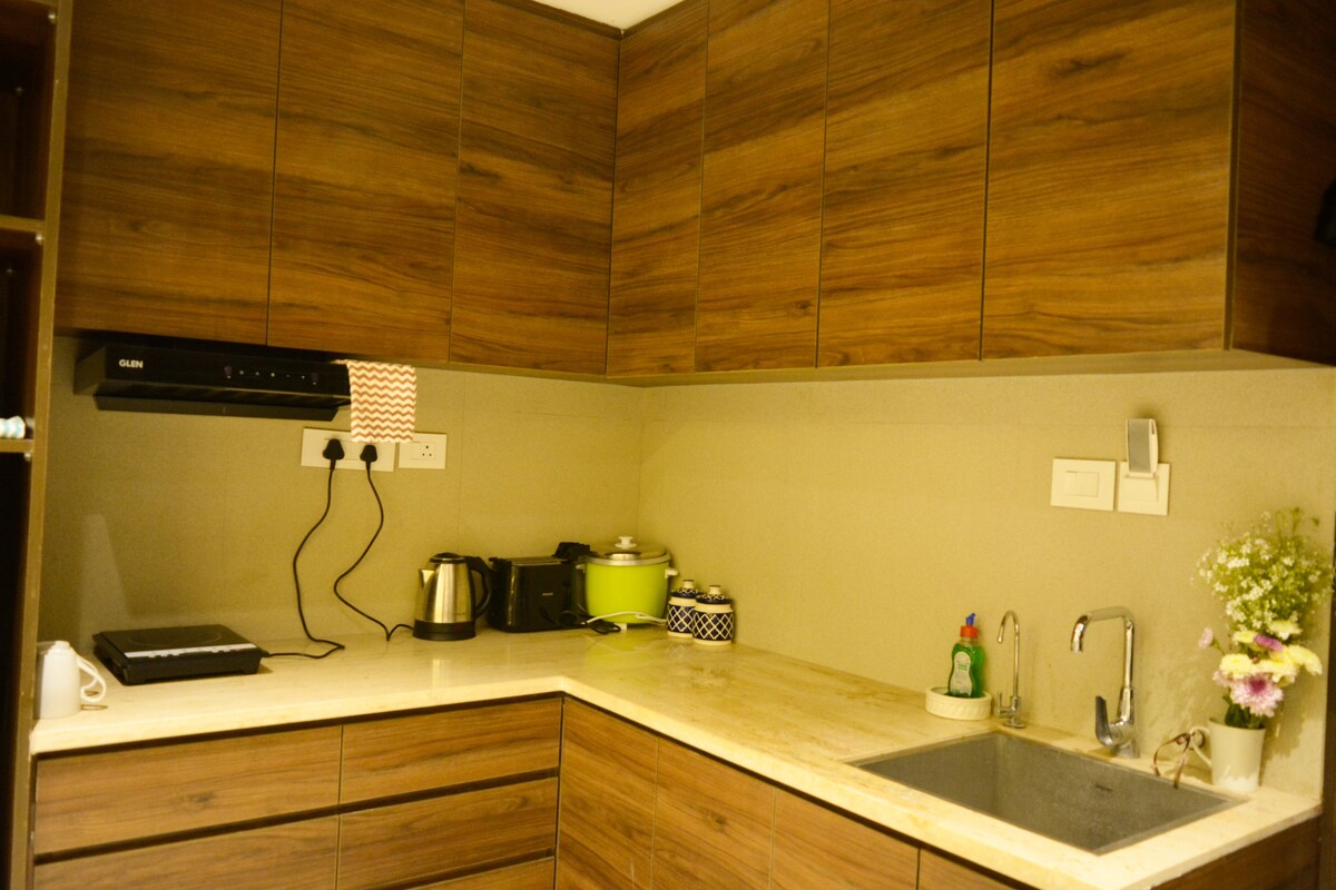 Appartement de service haut de gamme 1BHK dans le secteur 43, Gurgaon avec climatisation dans le salon et la chambre, ainsi qu'une kitchenette avec induction, micro-ondes et couverts. Dans un quartier chic, à distance de marche du centre commercial Gold Souk et de l'école Shalom Hills, à 2,2 km du métro Millennium City Centre et à 2,1 km de l'hôpital Fortis. Les voyageurs étrangers sont les bienvenus. L'arrivée anticipée sera soumise à la disponibilité et facturée 500 Rs. Le départ tardif sera également facturé 500 Rs pour chaque 3 heures supplémentaires.