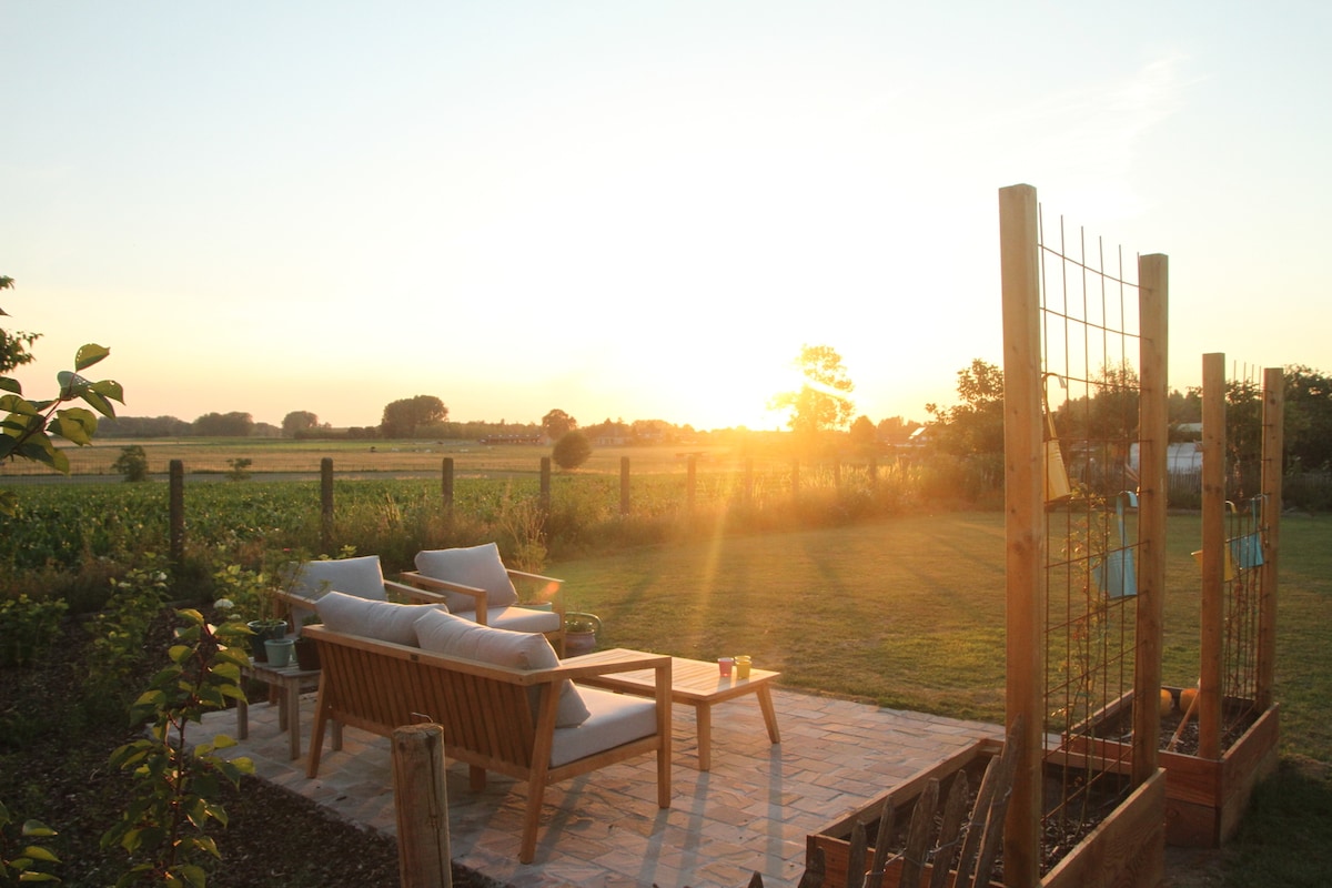 Au rez-de-chaussée, vous entrez dans la maison et vous prenez immédiatement les escaliers jusqu'au premier étage. Il y a la chambre, la salle de bain et les toilettes. Ensuite, vous montez par les escaliers fixes du grenier et vous entrez dans le loft. Vous pouvez rester dans cet espace confortable. Vous avez le coin salon, la table à manger et la cuisine. La porte de la grande fenêtre ronde vous amène à la terrasse. Vous devez monter deux escaliers pour vous rendre au loft.Le 2e lit se trouve dans le coin salon. Un peu dangereux pour les enfants,donc seuls les bébés sont autorisés.