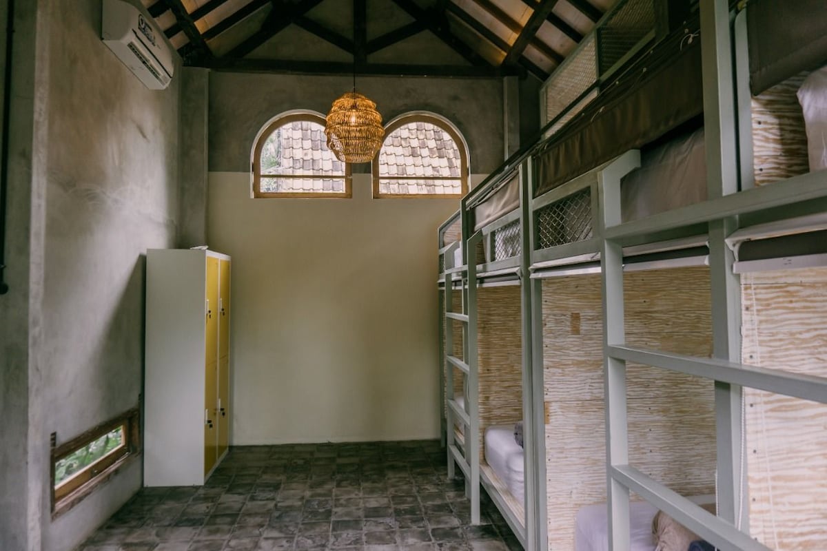 Chambre en forme de dortoir avec lits superposés contenant huit cabines dans le village de Celuk qui est le centre de l'artisanat d'argent célèbre à Bali. Cette villa est également proche de diverses zones touristiques intéressantes telles que le zoo de Bali, le marché d'art de Sukawati, un spot de surf amusant qui s'appelle Keramas Beach et à seulement 20 minutes d'Ubud et de Denpasar. Vous aurez également l'impression de vivre dans un environnement local convivial avec une variété d'activités quotidiennes.