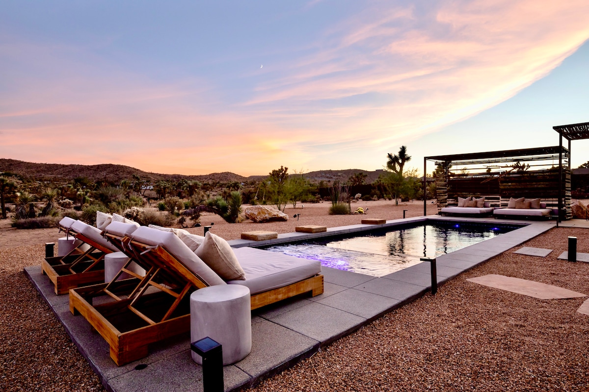 Évadez-vous dans un sanctuaire isolé de 2 hectares au milieu du désert, où la piscine chauffée et le spa côtoient une architecture et un paysage bruts. Conçu pour l'intimité et un cadre de vie de qualité, à 6 miles de Joshua Tree. Domaine privé sécurisé avec vue panoramique sur le désert et environnement désertique ouvert, dans un calme absolu sous le vaste ciel du désert. • Piscine + spa • Cercle de yoga + pétanque • Foyer + observation des étoiles • Espace repas extérieur + four à pizza • Système Sonos + chargeur Tesla • Services de conciergerie (chef, massage, guérison par le son) • Peignoirs + équipements Wonder Valley