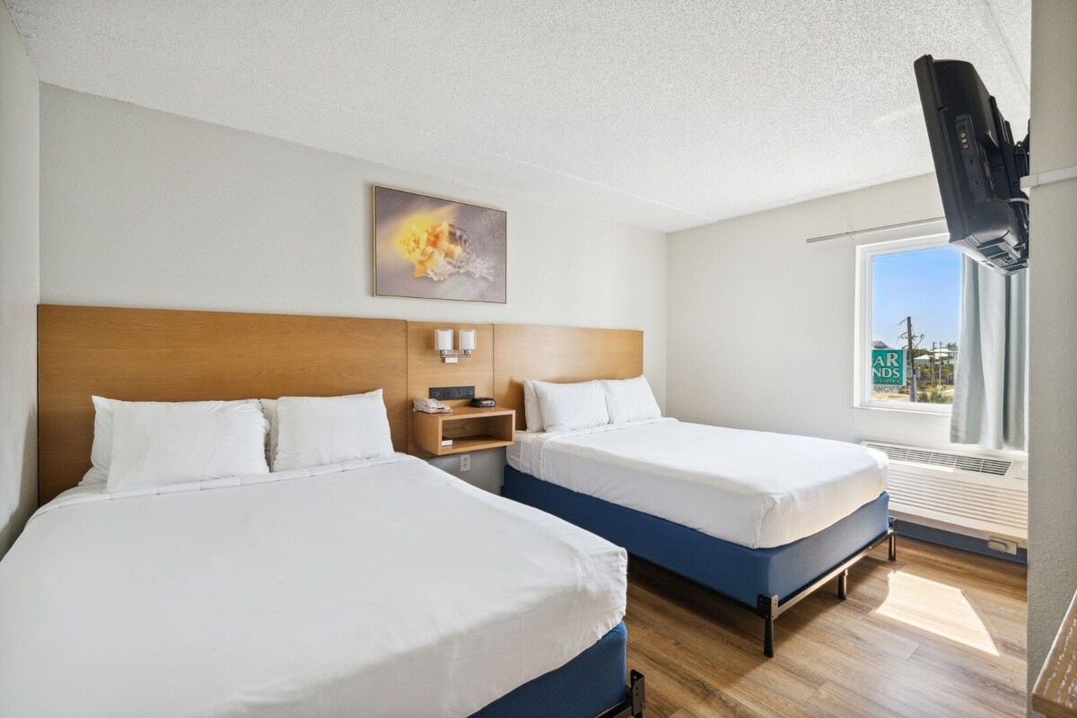 Auberge en bord de mer gérée professionnellement par Newman-Dailey Une chambre confortablement spacieuse avec deux lits Queen Size. Idéalement situé au rez-de-chaussée. Chaque lit est joliment décoré et dispose d'un matelas à plateau-coussin. D'agréables couleurs côtières décorent les murs. Cette chambre est entièrement équipée avec un mini-réfrigérateur, un four à micro-ondes, un grille-pain, une machine à café à dosettes, un cuiseur vapeur et un sèche-cheveux. La chambre dispose également d'une télévision et d'une connexion Internet sans fil. Toute la pièce dispose d'un sol en vinyle de luxe et de ventilateurs de plafond éclairés.