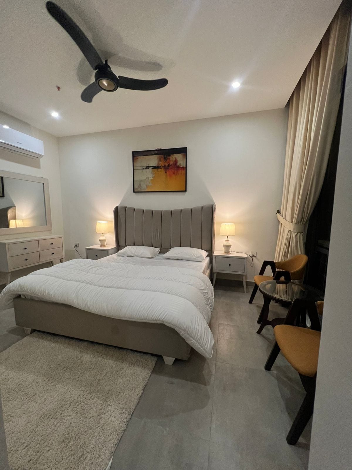 Appartement design 1 pièce | Centre commercial Zeta et vue sur les collines Lit «✨ king size » et balcon privé Télévision connectée📺 55 pouces et WiFi ultra-rapide 🍳 Cuisine entièrement équipée ❄️ Climatiseurs et eau chaude 🔒 Serrures connectées et décoration moderne 🏙️ Au-dessus de l'aire de restauration du centre commercial Zeta, à quelques pas du centre commercial Giga Vues 🌄 panoramiques sur les collines Parfait pour les familles et les voyageurs d'affaires. CNIC requis (18+). Interdiction de fumer/faire la fête. Réservez maintenant pour le confort et le style !