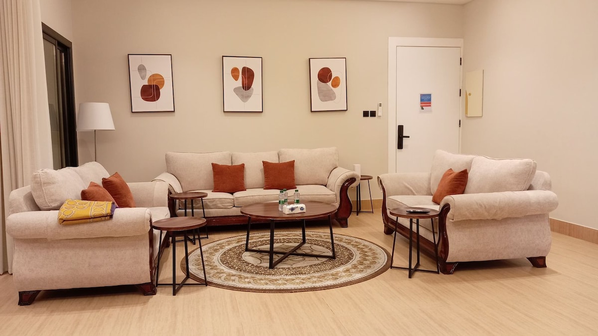 Sweet Home 4 – Appartement d'hôtel avec 1 chambre et cuisine Hébergement moderne avec arrivée autonome dans le quartier d'Al Orouba – Dammam, entièrement meublé et adapté à la location quotidienne et au long séjour Caractéristiques : Une chambre avec un lit queen size, un salon avec un écran intelligent et des abonnements de divertissement, un accès Internet rapide, une cuisine fonctionnelle, une salle de bains moderne, un parking public et une arrivée autonome intelligente. Emplacement : Proche de Lulu et Tamimi, des principaux hôpitaux, d'Aramco et Dhahran, de Half Moon Beach, et à 15 minutes ou moins de l'aéroport international King Fahd.