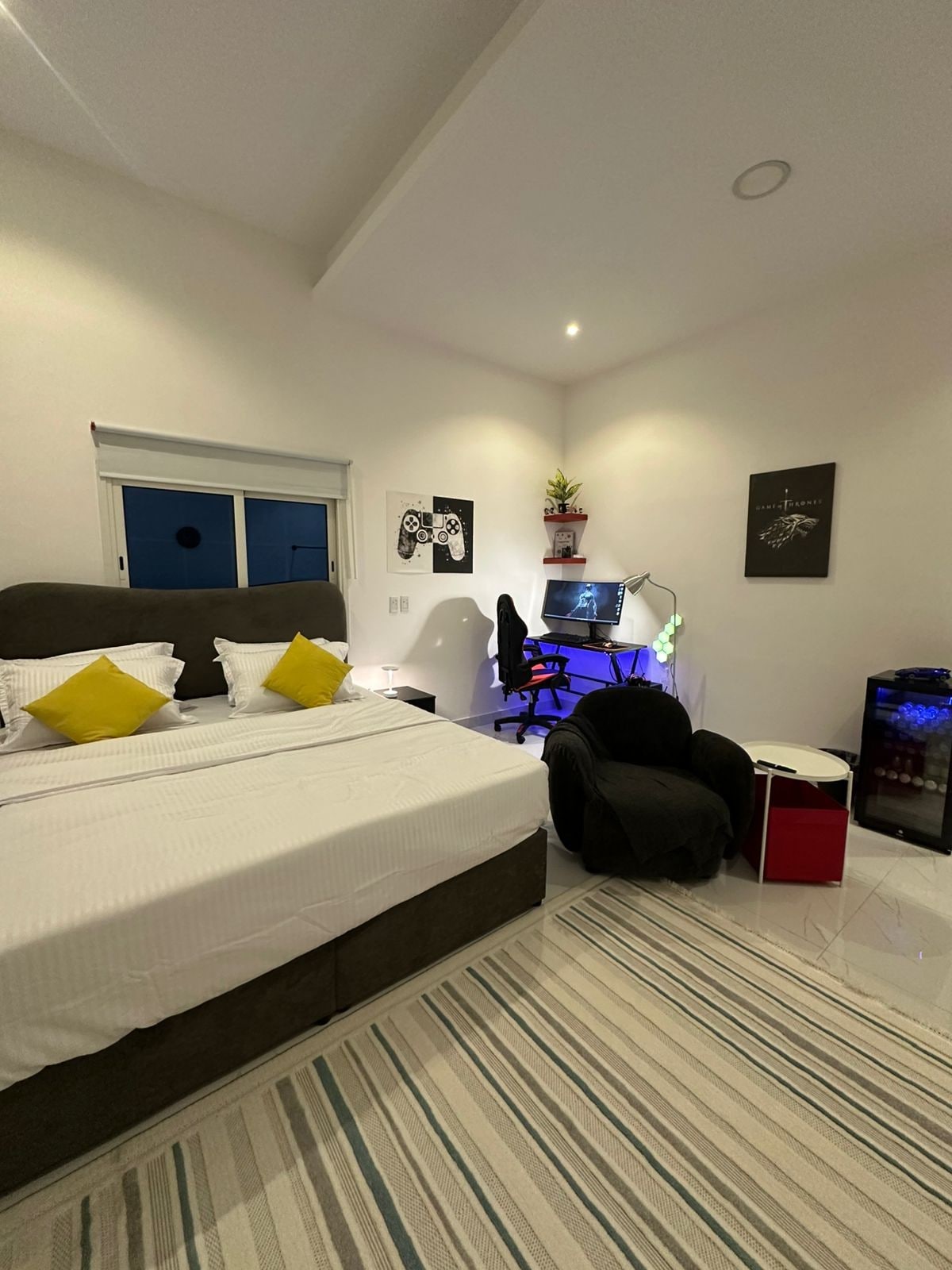 🎮 Studio pour gamers Un studio spacieux et équipé qui allie confort, divertissement et travail, et comprend : 🛏️ Grand lit confortable 🍳 Cuisine intégrée ☕ Cafetière d'angle V60 🥤 Réfrigérateur avec boissons non alcoolisées et eau 📺 Divertissement 📡 La grande télévision prend en charge : Shahid – Netflix – YouTube Premium Accès Internet haut débit 🛋️ Sièges et repos 🛋️ Canapé confortable pour se prélasser 🖥️ Travail et loisirs 🪑 Bureau avec chaise ergonomique 💻 Un superordinateur avec un écran incurvé 🧼 Salles DE bain 🧺 Machine à laver 🧴 Savon à lessive + adoucissant 🚿 Shampoing, après-shampoing, savon 🧻 Serviettes et toutes les fournitures de soin